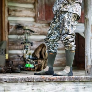 The lightest weight sock in our Hunt category. this was immediately identified as the perfect turkey-season hunting sock. And in warmer climates. it works as an early bow season sock. too. Cushion underfoot to let you know it’s there. but light mesh over the top practically goes undetected for breathability. Lightly ribbed Boot height holds position and is versatile in all styles of hunting boots.